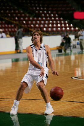 The bounce pass is a pass that bounces off the court once before it gets to your teammate; it is a very underrated pass in basketball. Many times there will be defenders getting their hands in the passing lanes, increasing a chance for a turnover. A regular horizontal pass is easy to deflect and pick off, but a bounce pass is much more difficult to catch. Here's how you do it... Hold the ball with both hands, similar to the way you hold a the ball when you're going to shoot. Now push the ball out with your dominant hand while using the other hand to guide it. Aim for an area halfway between you and your teammate for the ball to bounce (to create the right angle).